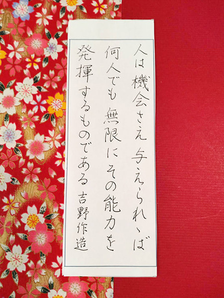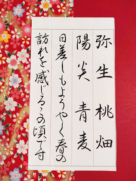 作品紹介 画像をクリックすると拡大します 毛筆・硬筆のお手本(サンプルです。課題は毎月変わります。) 毛筆手本例(小学1年生) 毛筆手本例(小学2年生) 毛筆手本例(小学3年生) 毛筆手本例(小学4年生) 毛筆手本例(小学5年生) 毛筆手本例(小学6年生) 毛筆手本例(中学1年生) 毛筆手本例(中学2年生) 毛筆手本例(中学3年生) 硬筆手本例(小学1年生) 硬筆手本例(小学2年生) 硬筆手本例(小学3年生) 硬筆手本例(小学4年生) 硬筆手本例(小学5年生) 硬筆手本例(小学6年生) ペン字手本例 栗原智賀子の作品 読売書法展「秀逸」受賞作品こぬ人を まつほの浦の夕なぎに 焼くや藻塩の身もこがれつつもろともに あはれと思へ山桜花よりほかに知る人もなし 読売書法展 入選めぐり逢ひて 見しやそれともわかぬ間に 雲がくれにし夜半の月かな年暮れて わがよふけゆく風の音に 心のうちのすさまじきかな 読売書法展 入選あし引の山ほととぎす をりはへて たれかまさるとねをのみぞなく梅が香を 袖にうつして とどめてば はるはすぐとも かたみならまし 楓林江色寒(ふうりんこうしょくさむし) 古典「出師表(すいしのひょう)」臨書 月影の 宿れる袖は せばくとも 留めても見ばや あかぬ光を 人はいさ 心も知らず ふるさとは 花ぞむかしの 香ににほひける(紀貫之) 夕立の 雲間の日影 はれそめて 山のこなたを わたる白鷺 (藤原定家) 草の葉に かくれんぼする 蛙かな(小林一茶) 「往者諌むべからず」過去の出来事に悔んだり反省することはあっても固執することなく未来に目を向けるべきという意味です。 ページトップへ